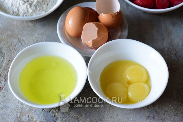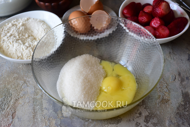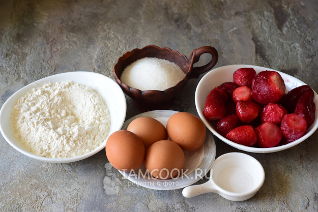 Отмеряем необходимые ингредиенты для приготовления простого и быстрого пирога с клубникой в духовке. Если у вас клубника свежая, то переберем, почистим и помоем ягоды.