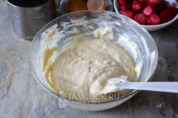 Аккуратно муку вмешаем лопаткой, должно получиться воздушное тесто.