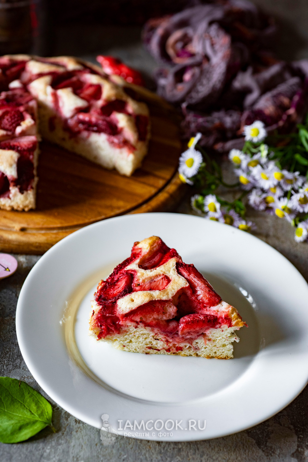 Простой и быстрый пирог с клубникой готов. Охладим его и нарежем на аппетитные кусочки. Приятного аппетита!