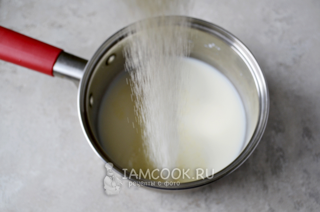Поставьте сотейник с молоком на огонь, добавьте щепотку соли, сахар (1 ст.л.) и всыпьте манную крупу. Сразу же размешивайте крупу, чтобы каша не получилась комочками.