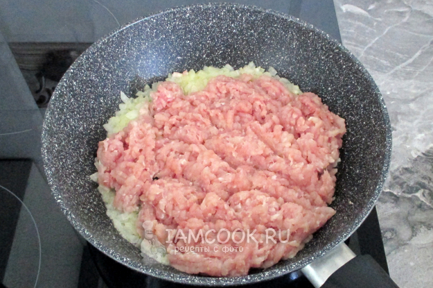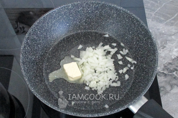 Для начинки сначала на сливочном или растительном масле обжарьте мелко нашинкованный лук.