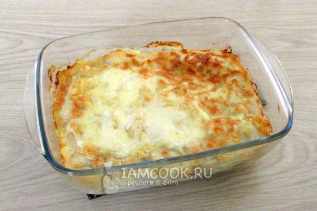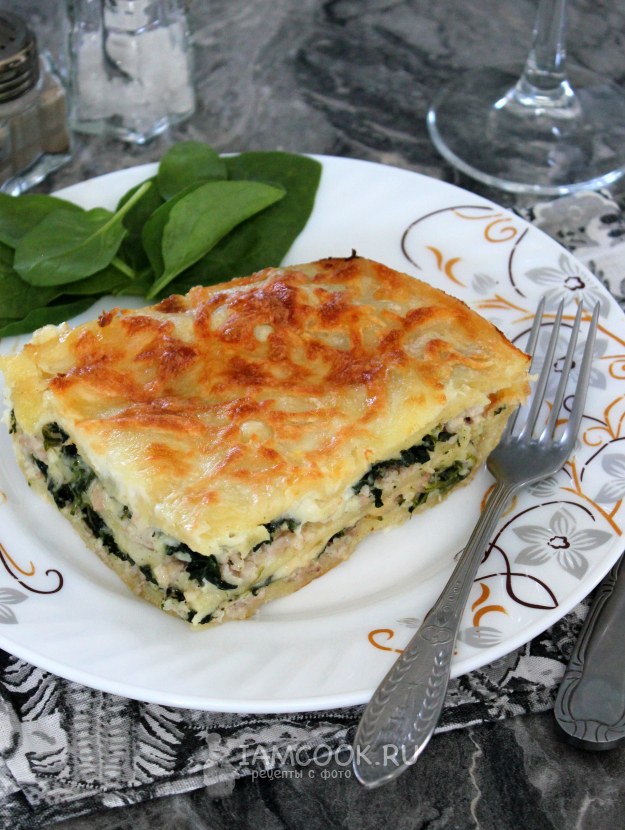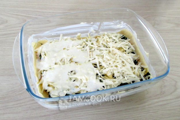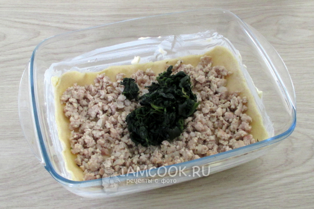 На него разложите половину куриного фарша. На фарш – слой из половины шпината. Затем идут тертый сыр и треть имеющегося соуса бешамель.
