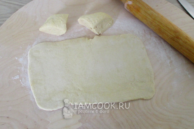 Тесто для листов лазаньи разделите на три части. Одна часть пусть будет немного побольше, чем две остальные. Из этой части сделаем первый лист, т.е. расположим внизу. Раскатайте его скалкой и растяните так, чтобы он получился такой же конфигурации, как и дно формы. Делаю этот лист немного потолще и побольше, чем будут верхние листы.