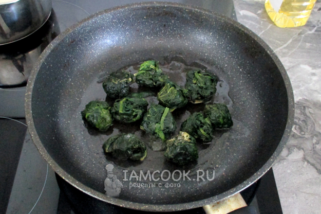 Потушите сырой или разморозьте замороженный шпинат на среднем огне на сковороде. По желанию можете его затем измельчить ножом или блендером. Соль, специи - по вкусу.