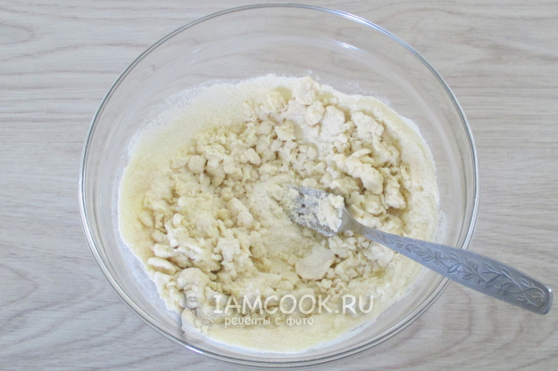Для приготовления теста соедините холодную воду с растительным маслом и добавьте муку твердых сортов пшеницы с солью. Перемешайте, чтобы ингредиенты схватились.