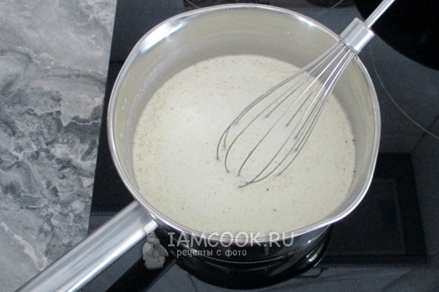 Затем порциями влейте молоко, каждый раз перемешивая венчиком. Не забудьте про соль и мускатный орех. Варите соус на среднем огне при частом помешивании до загустения. Укройте до использования поверхность бешамеля пищевой пленкой, если не хотите, чтобы образовалась типа пенка.