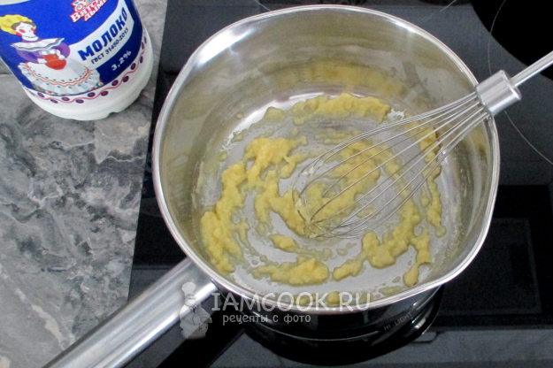Чтобы сварить соус бешамель, поставьте сотейник на средний огонь и растопите сливочное масло. Добавьте муку и обжарьте всё вместе - подрумяньте при помешивании.