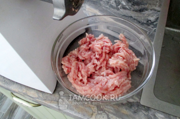 Куски куриного мяса нужно прокрутить в мясорубке.
