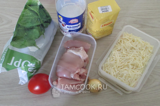 Подготовьте ингредиенты для лазаньи с курицей и шпинатом.