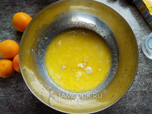 В тёплом молоке развести дрожжи и сахар. Добавить растопленное масло.