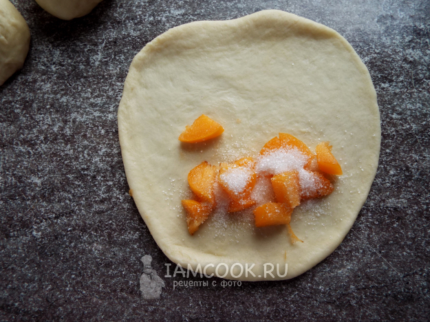 Из шарика сделать круглую лепёшку. На один край выложить кусочки абрикоса и присыпать сахаром.