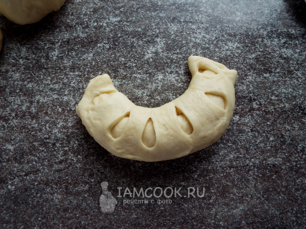 Нижним краем теста накрыть фрукт и немного прижать. На верхней части теста сделать надрезы.
