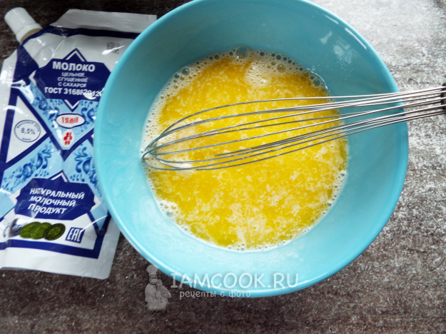 Яйцо и сгущенку взбить венчиком. Добавить растопленное масло.