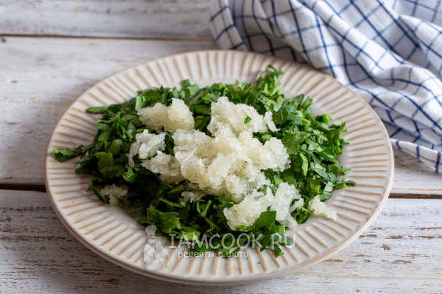 Петрушку помойте и нарежьте. Чеснок очистите и пропустите через пресс.