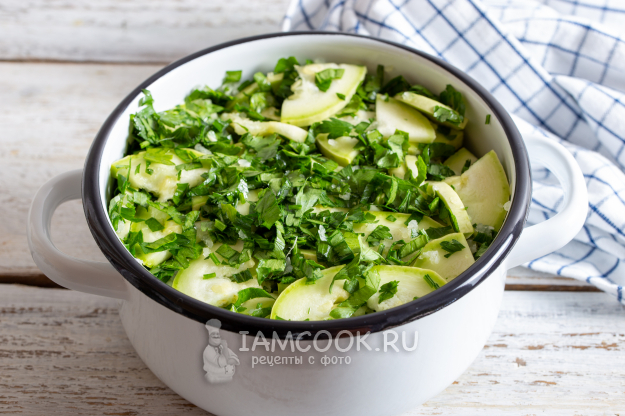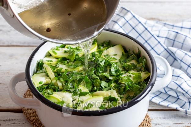 В глубокую кастрюлю уложите слоями кабачки и нарезанную петрушку с чесноком.