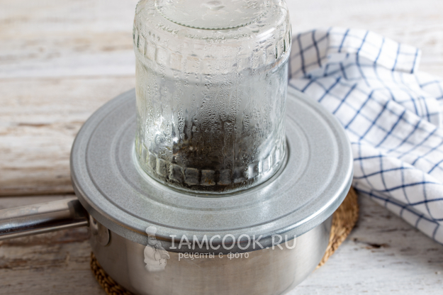 Прикройте банки крышками (но не завинчивайте), поставьте в кастрюлю с водой на умеренный огонь для стерилизации. Обязательно на дно кастрюли положите полотенце. Вода в кастрюле должна быть чуть выше половины банки. Кипятите их 20 минут.