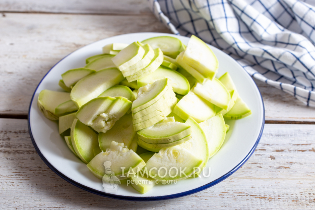 Кабачки помойте и тонко нарежьте. Маленькие кабачки можно нарезать на кружочки, чуть крупнее - на половинки или на четвертинки.