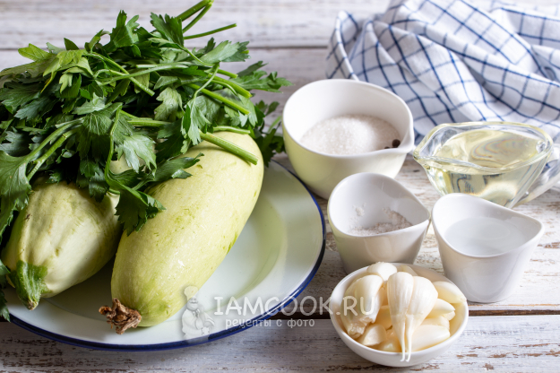 Подготовьте указанные ингредиенты для заготовки салата «Хризантема» из кабачков на зиму. Отдайте предпочтение молодым кабачкам с тонкой кожицей.