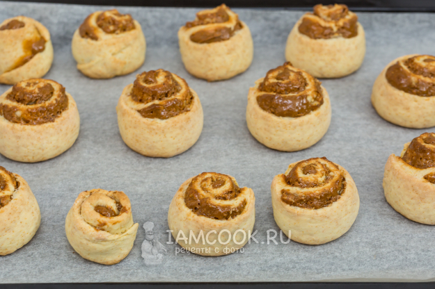 Выпекайте печенье с вареной сгущенкой и орехами в разогретой до 180 градусов духовке 15-20 минут.