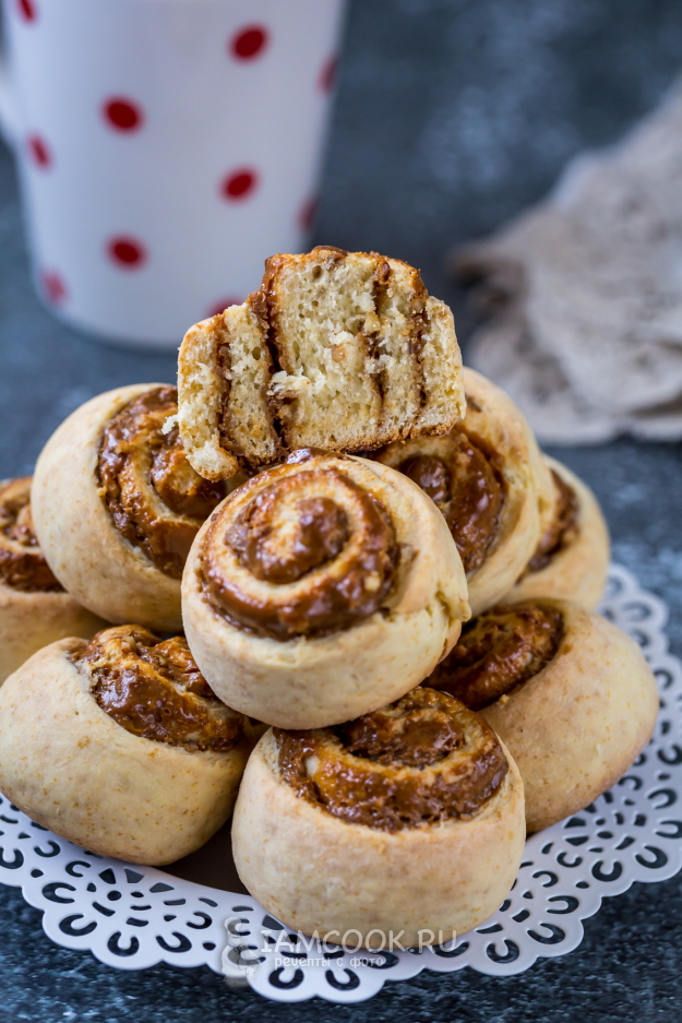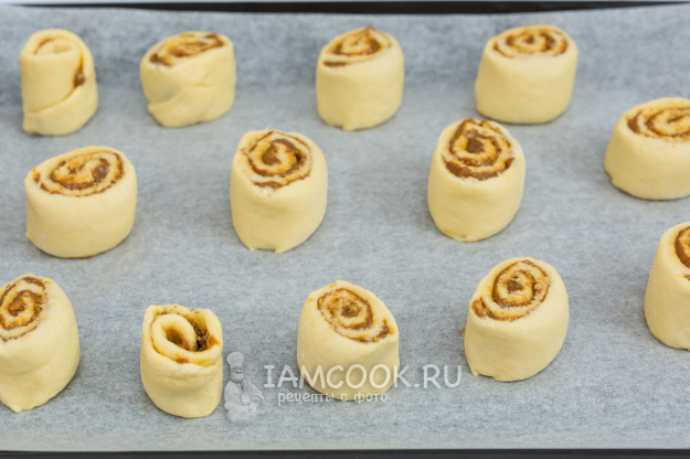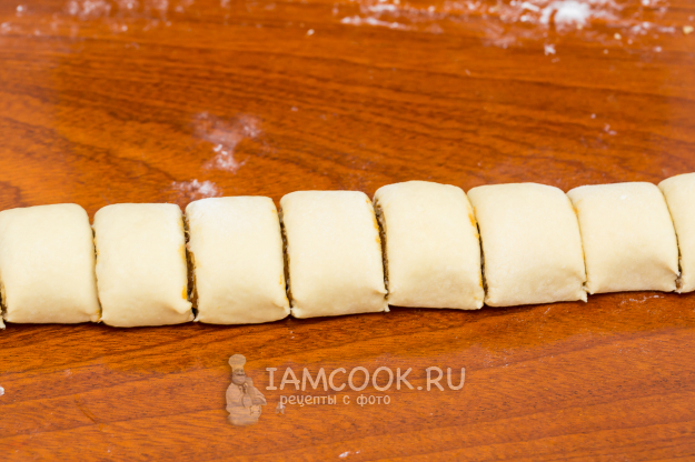 Рулет нарежьте на равные части (у меня получилось 15 штук толщиной примерно 2,5-3 см).
