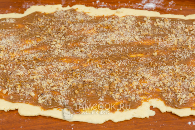 Смажьте пласт сгущенкой и присыпьте нарубленными мелко орехами.