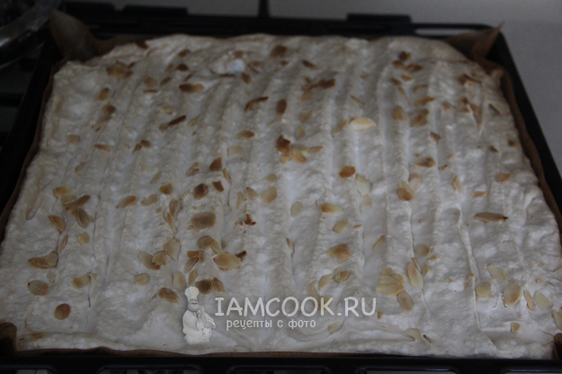 Противень застелить пергаментом или ковриком для выпекания. У меня противень - 30х30 см. Выложить белковую массу и равномерно распределить. Я сделала лопаткой волны и присыпала меренгу миндальными лепестками, но можно этого не делать.