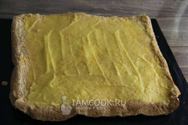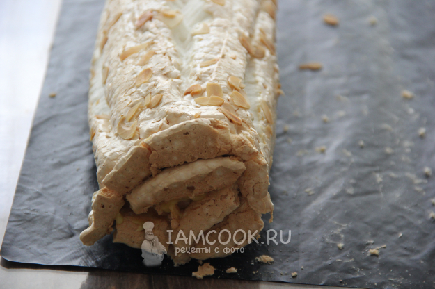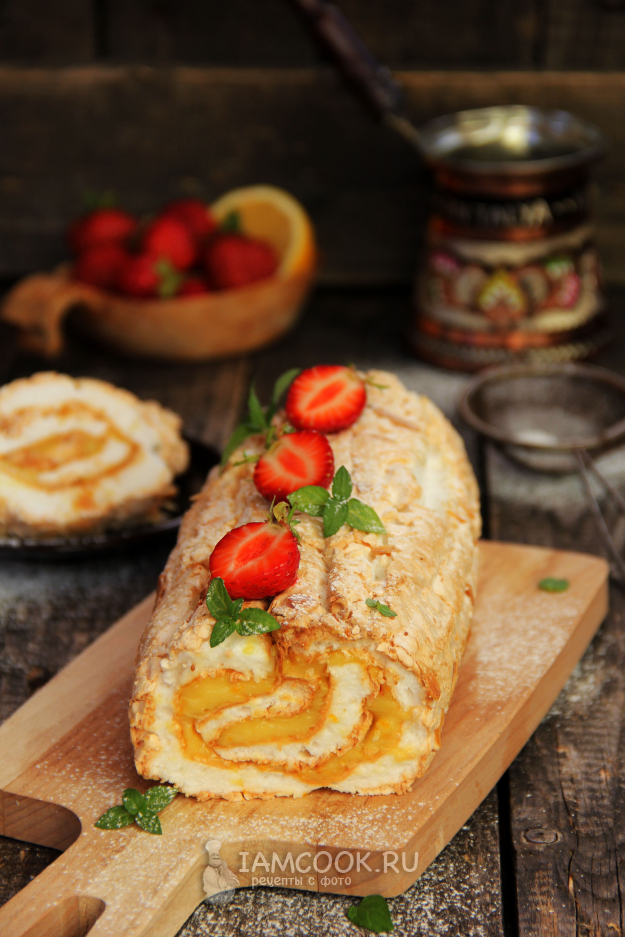 Свернуть меренговый рулет с апельсиновым курдом. Завернуть в пергамент и поместить в холодильник минимум на 3-4 часа.