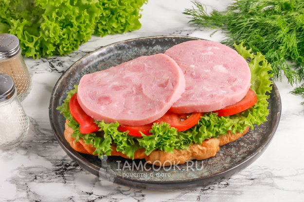 Нарежьте ветчину и выложите на слой помидоров. Если у вас есть в наличии ломтерезка, то можно нарезать ветчину тонкими слайсами.