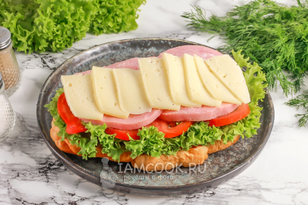 Накройте сыр оставшимся листовым салатом и сверху выложите поджаренную верхушку круассана. Сэндвич-круассан с ветчиной и сыром полностью готов! Не забудьте заварить ароматный чай либо кофе.