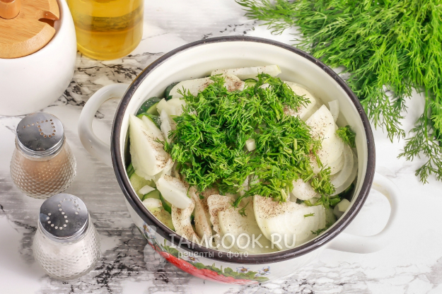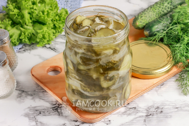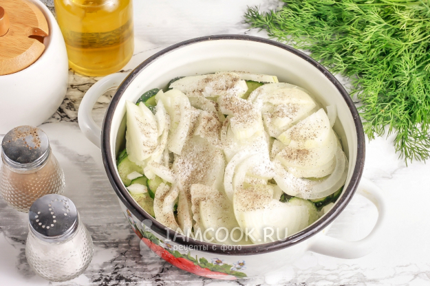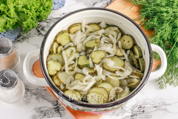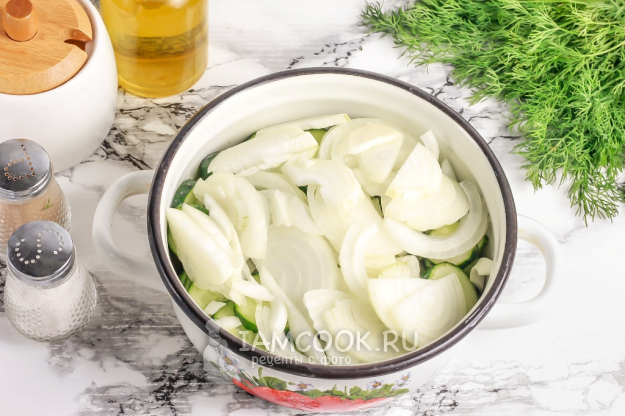 Выложите огуречную нарезку в казан или кастрюлю. Очистите репчатый лук и промойте, нарежьте полукольцами. Мелкие луковички можно нарезать кольцами. Добавьте в емкость.