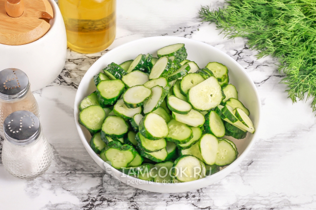 Огурцы тщательно промойте в воде, смойте пыль, шипы с их поверхности. Срежьте хвостики и попробуйте каждый из них на вкус. Особенно это касается приобретенных на рынке овощей. Нарежьте каждый из них кружочками, но не слишком широкими. После маринования огурцы выпустят сок и масса уменьшится в размерах.