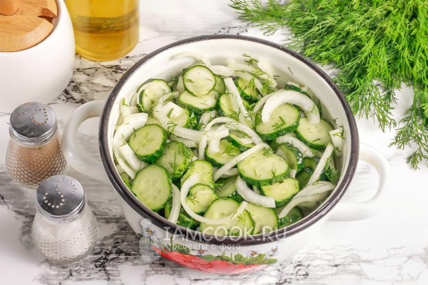 Аккуратно все перемешайте и оставьте при комнатной температуре на 1-1,5 часа. Перемешивайте каждые полчаса всю массу. Огурцы выделят сок и жидкости станет больше. Вот на этом этапе испытывается терпение кулинара - очень хочется половину съесть!