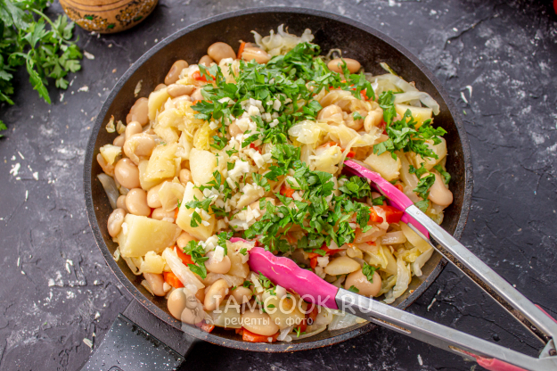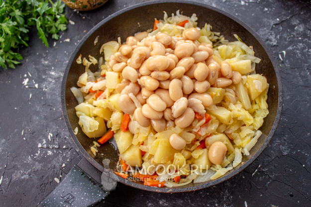 С фасоли слейте жидкость, добавьте ее в сковороду. Посолите и поперчите блюдо, аккуратно перемешайте и тушите еще 5 минут.