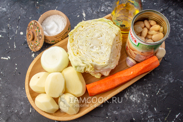 Подготовьте все необходимые ингредиенты для приготовления тушеной капусты с картошкой и фасолью.