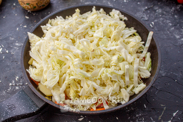 Добавьте капусту в сковороду к овощам. Если необходимо, то подлейте немного воды, но не забывайте, что капуста пустит сок в процессе тушения. Накройте сковороду крышкой, тушите при медленном нагреве 10 минут. За это время капуста значительно осядет и станет мягче, аккуратно перемешайте овощи, при необходимости долейте немного кипятка, снова накройте крышкой и тушите еще 5-7 минут.