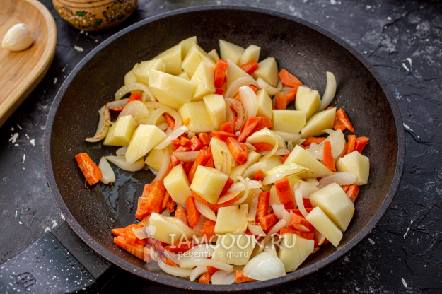 Добавьте к овощам, слегка обжарьте вместе - около 2-3 минут, затем налейте немного воды, чтобы она не покрыла картофель, а лишь дно сковороды. Доведите до кипения, сделайте медленный нагрев, тушите под крышкой 10 минут.