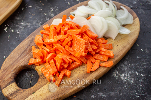 В сковороду нагрейте масло. Лук и морковь очистите, нарежьте небольшими кусочками, отправьте в сковороду и жарьте несколько минут, до мягкости.