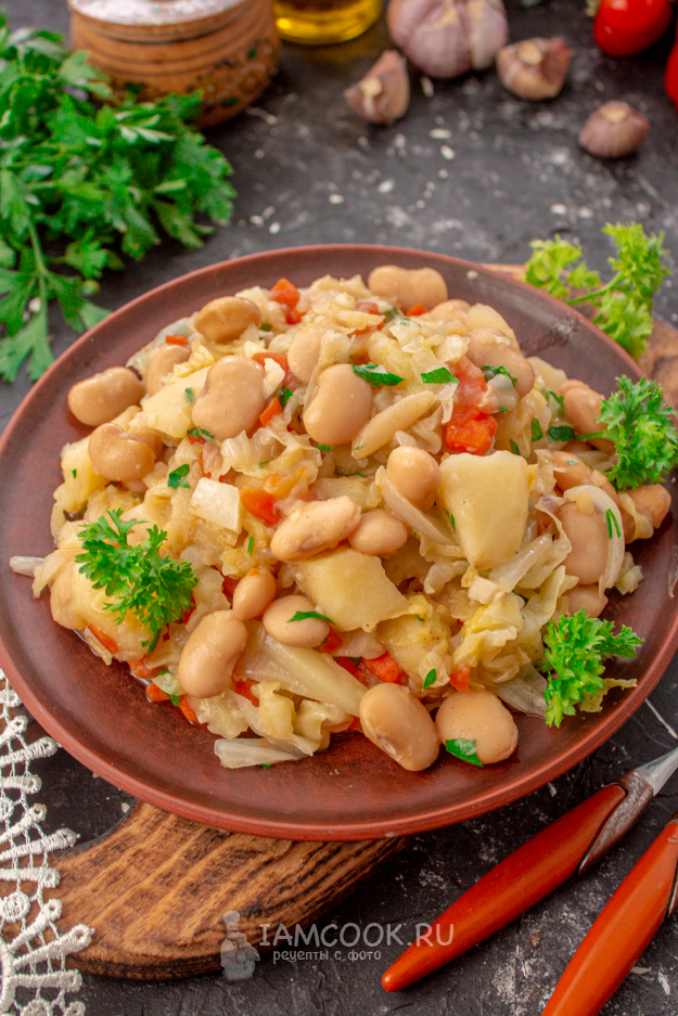 Фасоль при желании можно взять сухую и приготовить ее самостоятельно: замочите ее на ночь, затем отварите до полуготовности и добавьте к капусте вместе с картофелем, таким способом она дойдет до готовности вместе с остальными овощами. Кстати, сорт фасоли возьмите тот, который вам больше нравится. Подойдет любой.