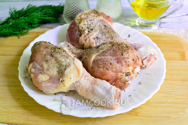 Куриные ножки промойте, просушите салфетками, затем мясо натрите солью, черным перцем и прованскими травами.