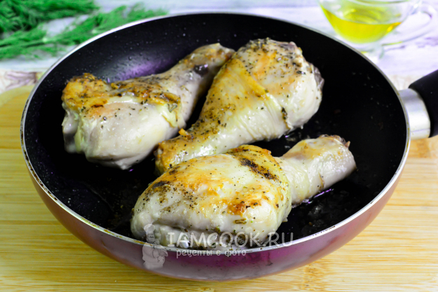 Разогрейте растительное масло на сковороде, выложите куриные ножки и обжаривайте на среднем огне с двух сторон по 7-8 минут, чтобы подрумянились.