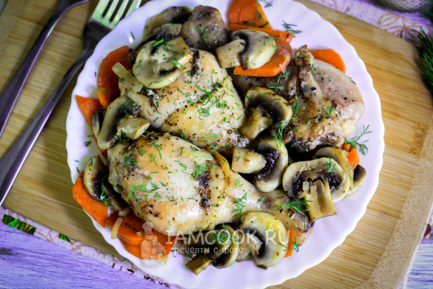 К обжаренным куриным ножкам выложите все овощи и грибы. Добавьте еще немного соли по вкусу.