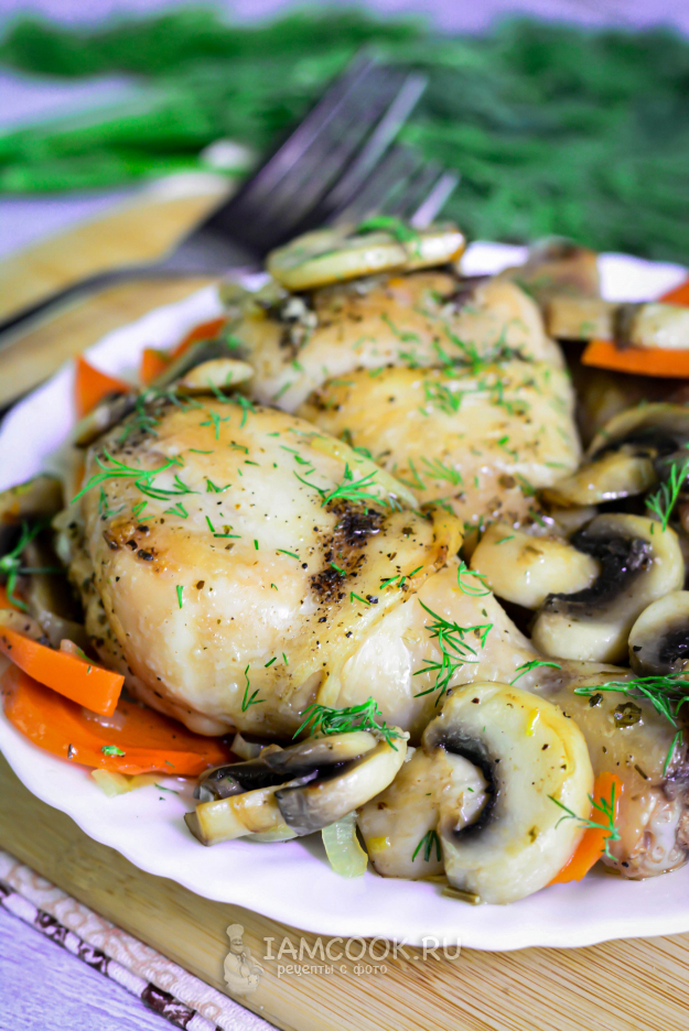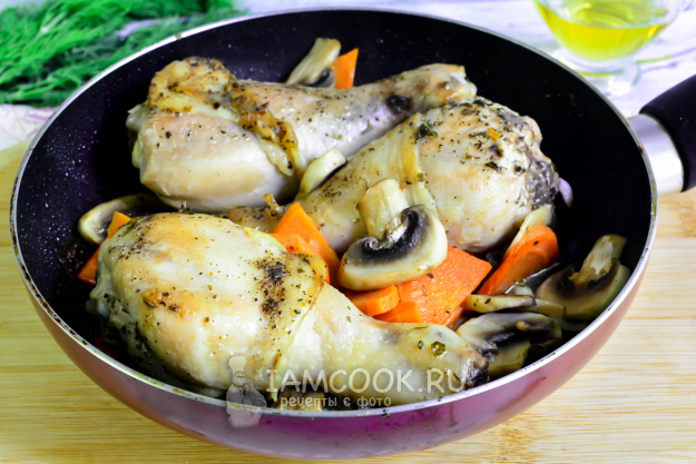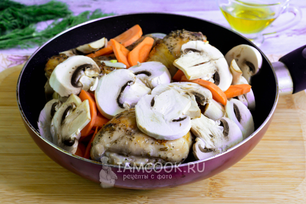 Обжаривайте курицу с грибами еще минут 10, перемешайте, затем убавьте огонь и готовьте блюдо под крышкой на небольшом еще минут 10, до готовности мяса. Если хотите, чтобы был легкий соус, влейте 60 мл горячей воды и тушите куриные ножки с грибами на сковороде еще 5 минут.