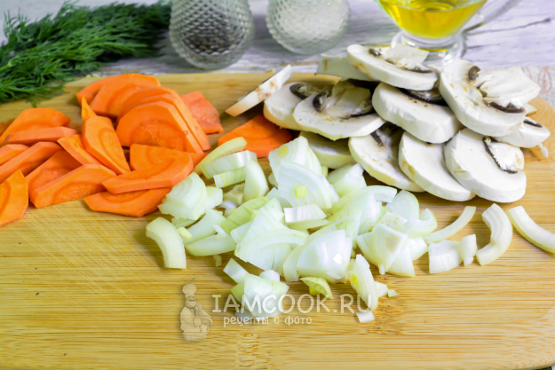 Почистите лук и морковь, грибы помойте. Морковь нарежьте полукружиями, лук - полукольцами, а грибы - пластинками.
