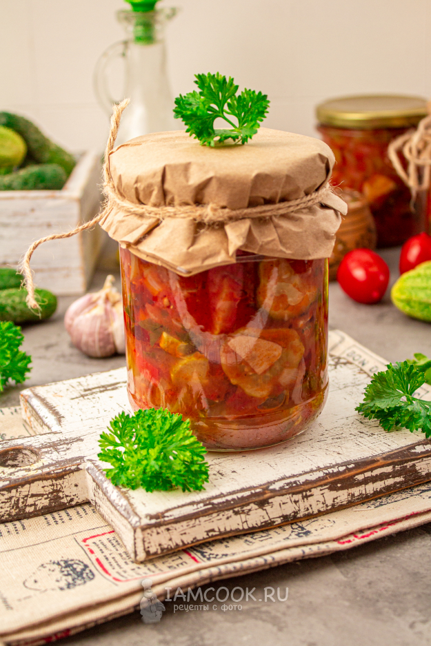 Выключите салат, добавьте уксус, перемешайте и сразу горячим разложите по баночкам вместе с образовавшимся соком. Плотно закрутите крышкой.