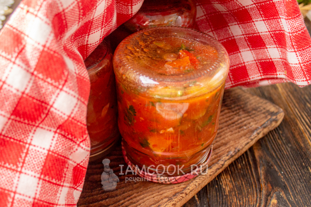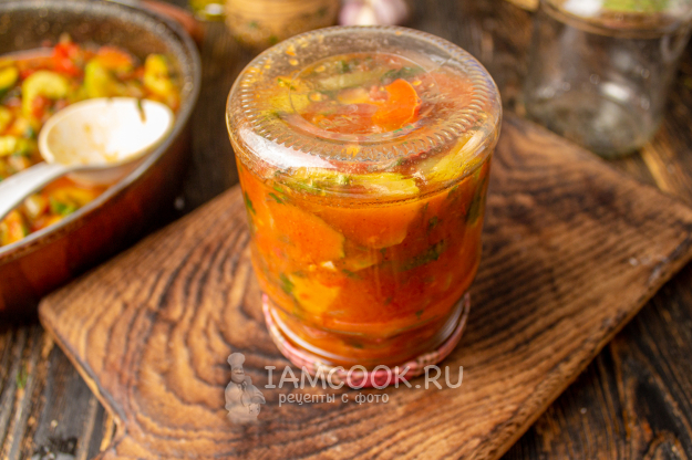 В томатный соус с овощами добавьте огурцы и зелень, тушите вместе еще 3-5 минут. К этому времени простерилизуйте удобным для вас способом банки и крышки.