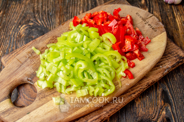 Сладкий перец очистите от семян, мякоть нарежьте небольшими кусочками. Добавьте его к луку, готовьте вместе пару минут.