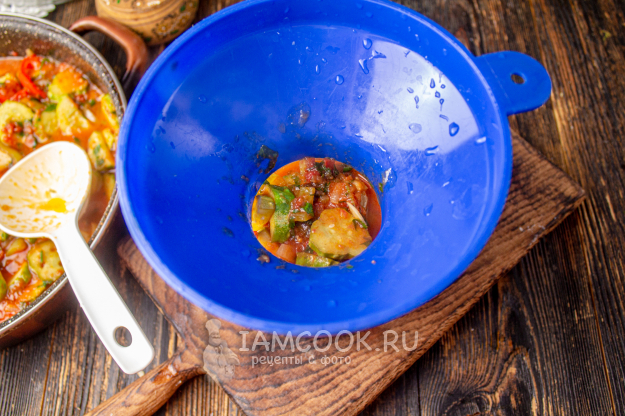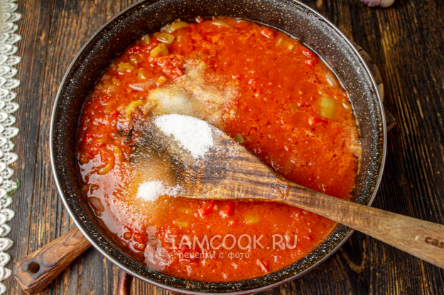 Влейте томатное пюре к овощам, добавьте соль, перец и сахар, тушите 5 минут.