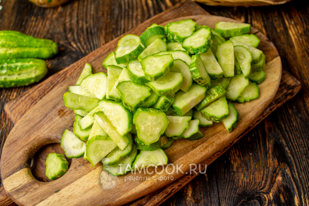Огурцы промойте, нарежьте кружочками, если попались крупные, то нарежьте полукружиями.