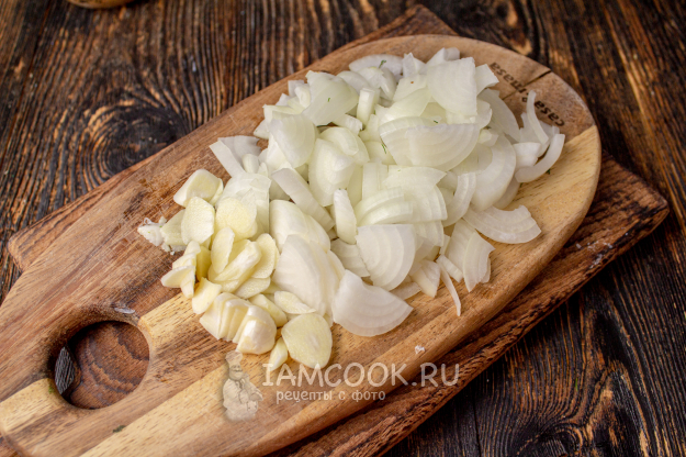 В кастрюлю с толстым дном налейте масло, поставьте на плиту, чтобы масло разогрелось. Тем временем лук очистите и нарежьте тонкими перьями, чеснок нарежьте тонкими пластинами. Выложите подготовленные овощи в масло и обжаривайте несколько минут, до мягкости.