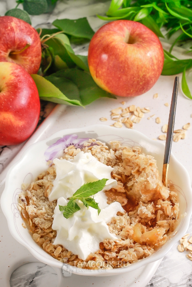 Украсьте яблочный крамбл взбитыми сливками или шариком мороженого, свежей мятой и подайте к столу. Заварите ароматный чай либо кофе.